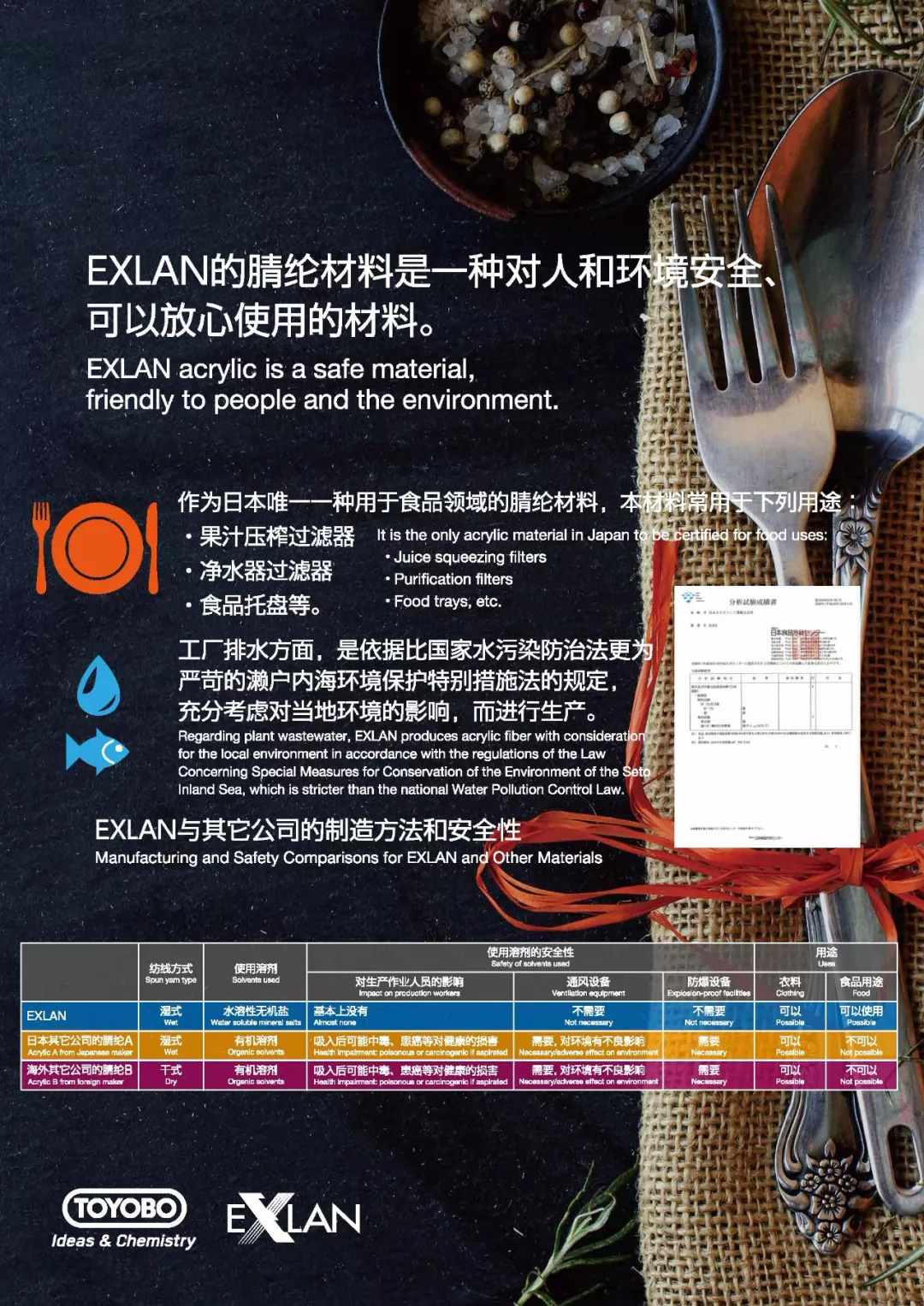 東洋紡腈綸作為日本唯一一種用于食品領域的腈綸材料,被用于果汁壓榨過濾器,凈水器過濾器,食品托盤等,直接與食品接觸的用途。日本作為世界上對食品安全最重視的國家之一,為什么會選用東洋紡腈綸作為食品領域的材料,而不是其他國家和公司的腈綸產品?